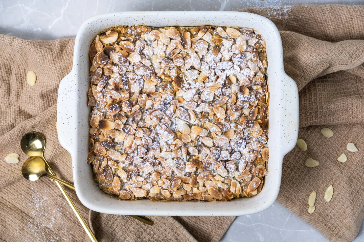 Warm, custardy baked oats inspired by a classic almond croissant — blended with applesauce for natural sweetness, almond butter for richness, a touch of almond extract, and a sprinkle of almond flour and slivered almonds for that golden, nutty crunch. 2 serving squares to an order