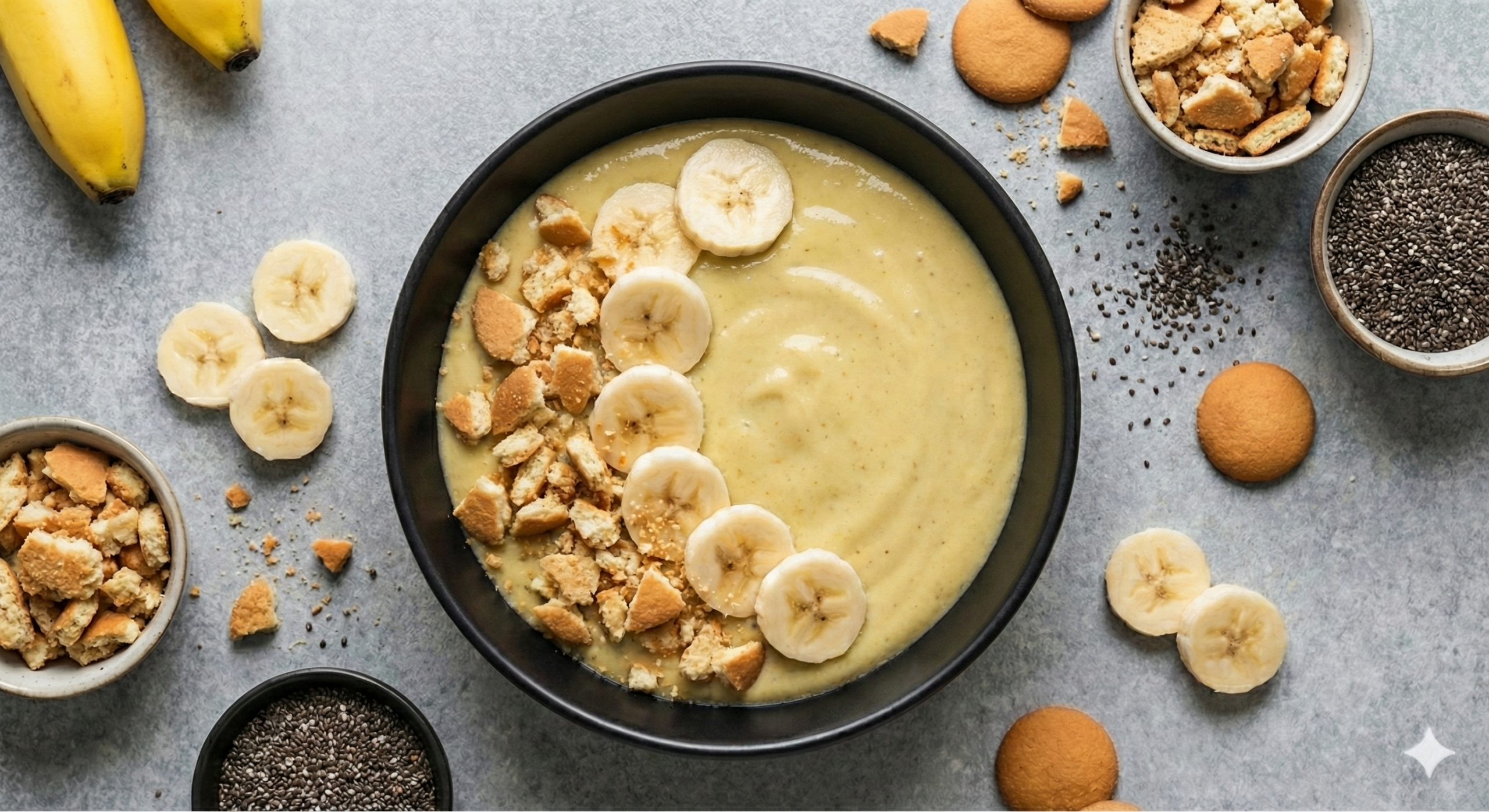 A classic banana pudding inspired treat made with blended chia into pure organic oat milk for a smooth, custard like texture. We blend ripe bananas and pure vanilla into it, then finish with fresh banana slices and house-baked clean nilla wafer crumbles on the side. Light enough for breakfast, comforting enough for dessert.
