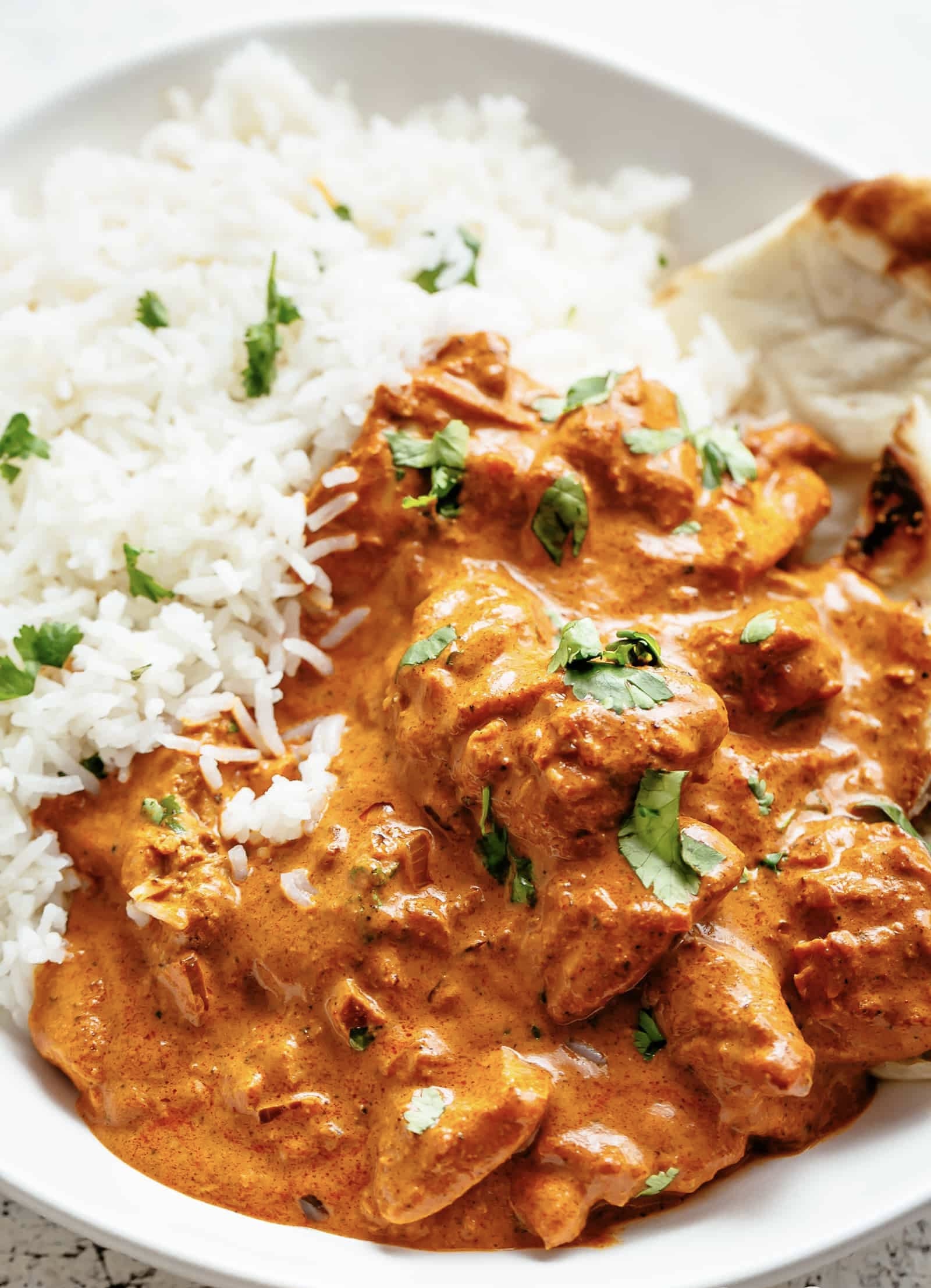 Tender, marinated chicken simmered in a rich, spiced tikka masala sauce, paired with fluffy Indian basmati rice and sweet green peas.