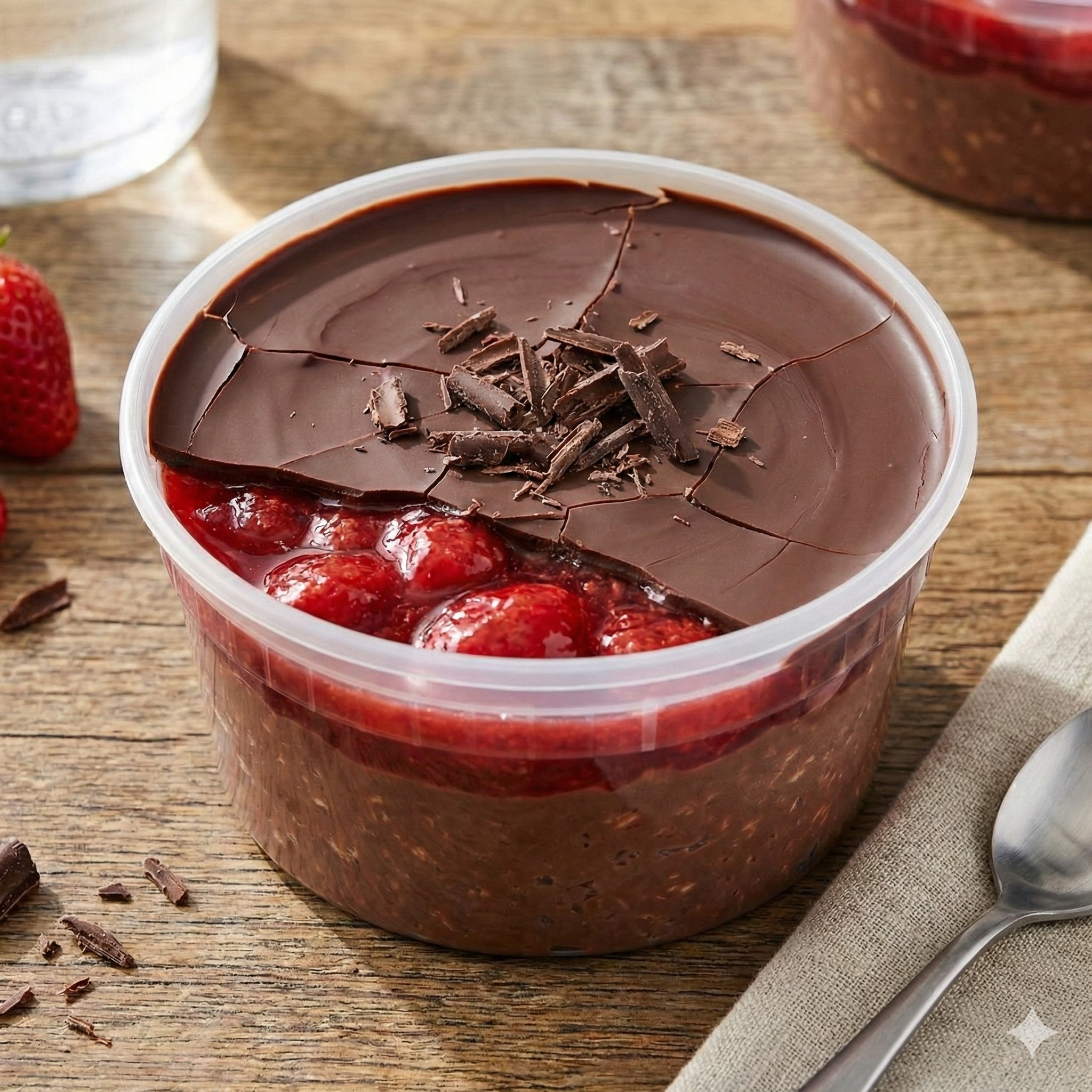 Dark chocolate overnight oats topped with a house-made strawberry compote, finished with a thin crackly chocolate shell that hardens on top—rich, balanced, and way more elevated than your average overnight oats.