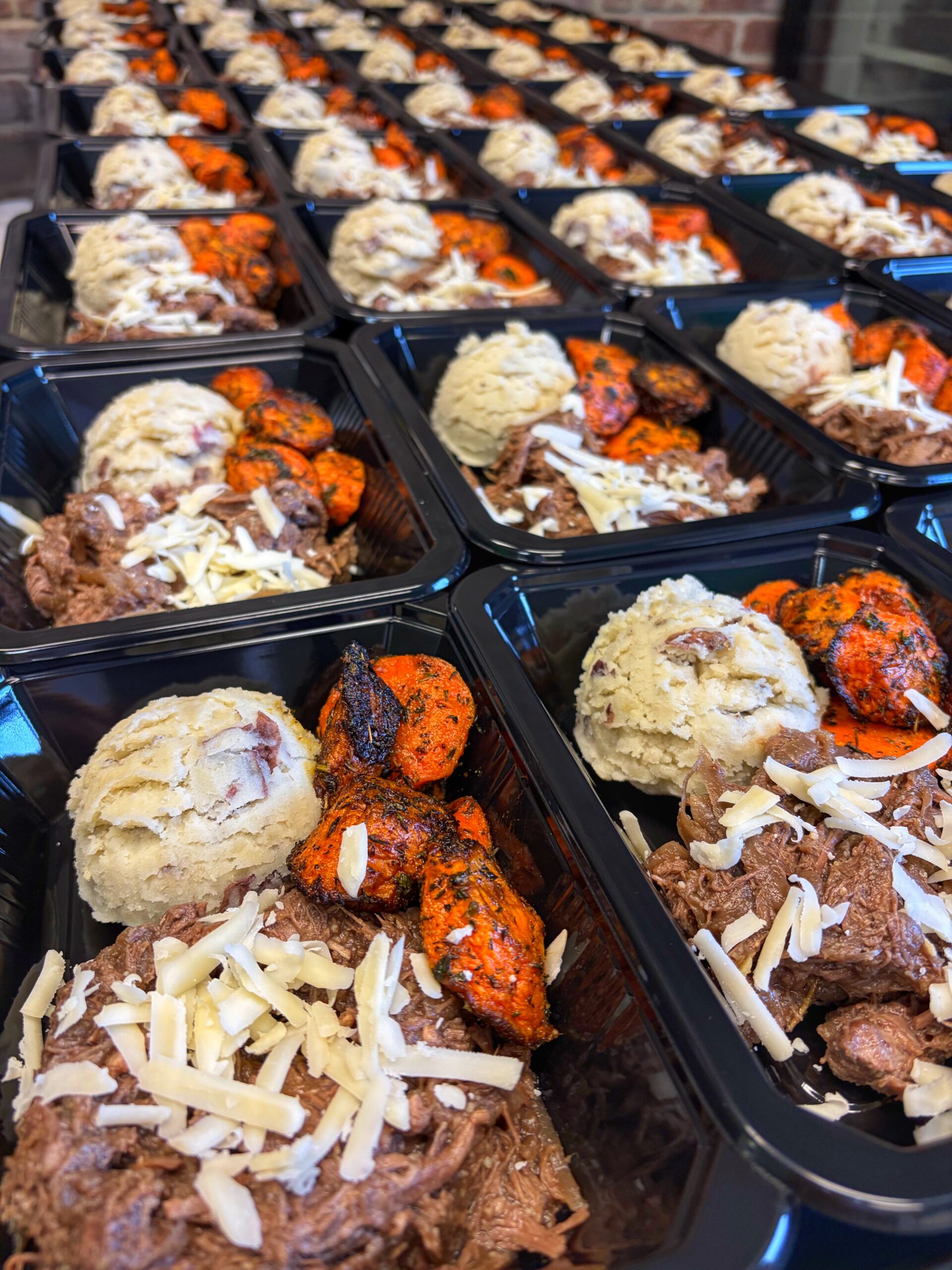 Tender braised beef slow cooked in deep caramelized onions. Topped with gruyere cheese, alongside mashed potatoes and homestyle roasted carrots