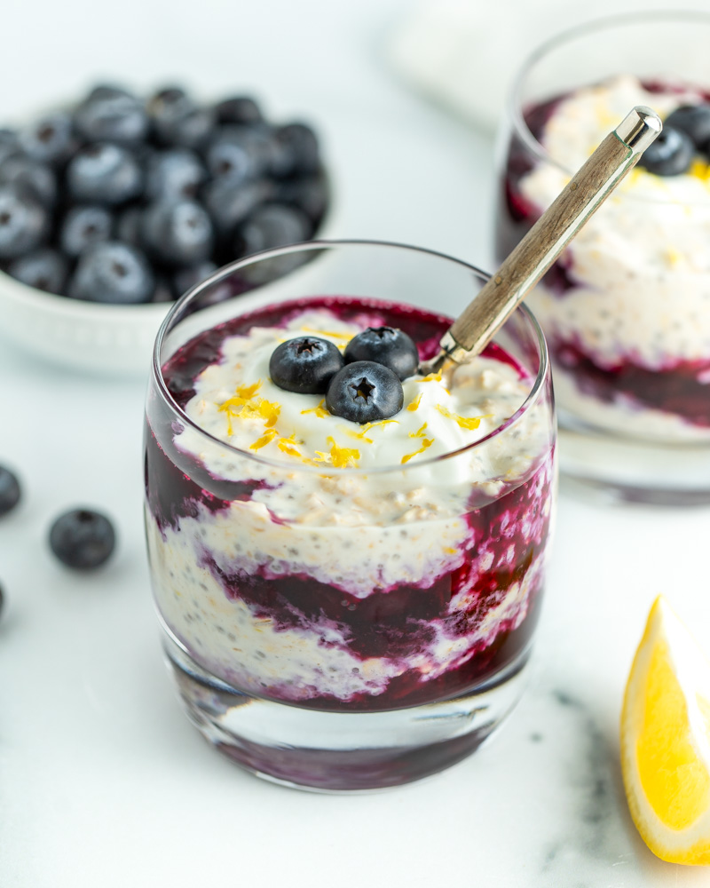 Creamy, high-protein lemon oats topped with a homemade blueberry jam compote.
