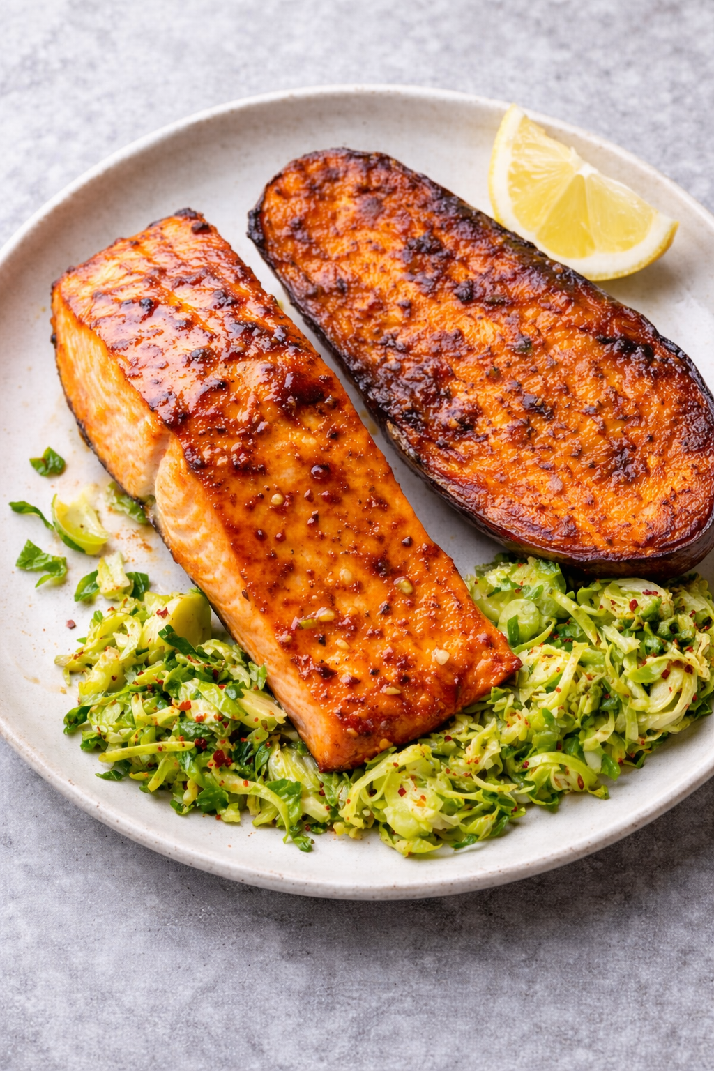 Perfectly roasted ocean raised salmon glazed with maple and Dijon, paired with cut-side caramelized sweet potato, shaved Brussels sprouts & finished with lemon.