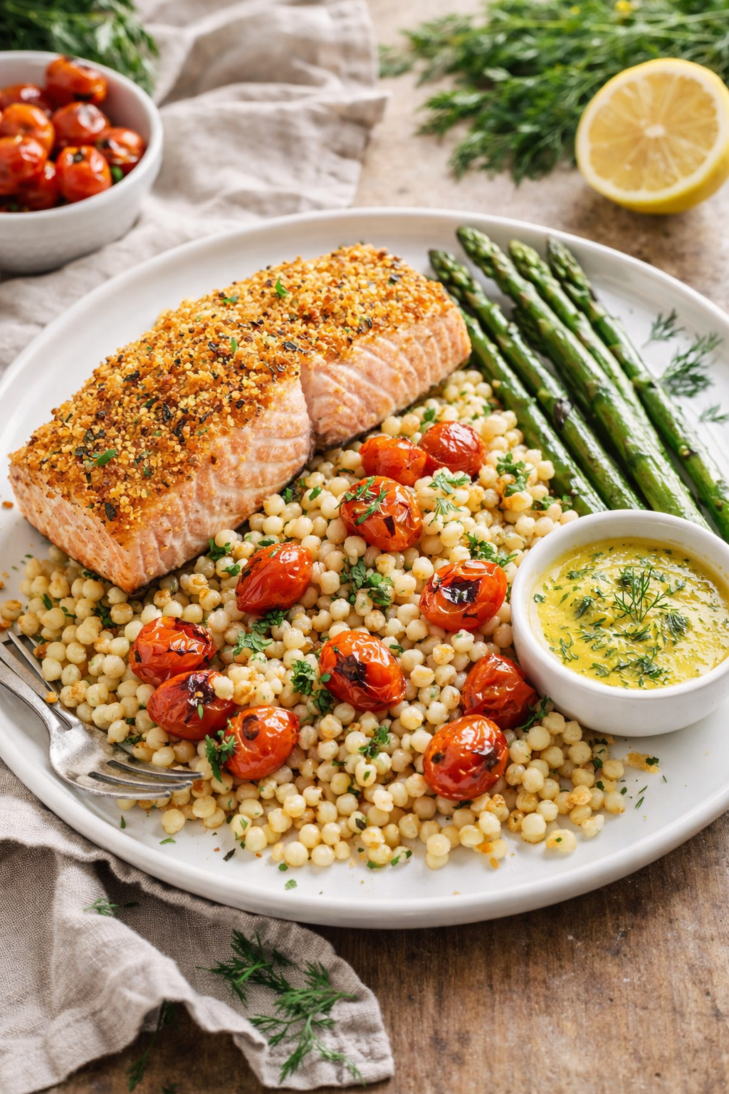 Panko Crusted Salmon over Pearled Couscous & Blistered Tomatoes