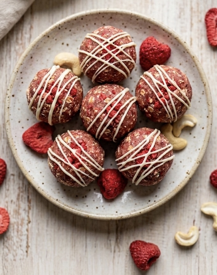 Soft dates blended with organic oats, grass fed protein, cashew butter & freeze dries strawberries. Finished with a drizzle of white chocolate. Rolled into bite-sized protein balls for a naturally sweet energy boost. 5 balls to an order.