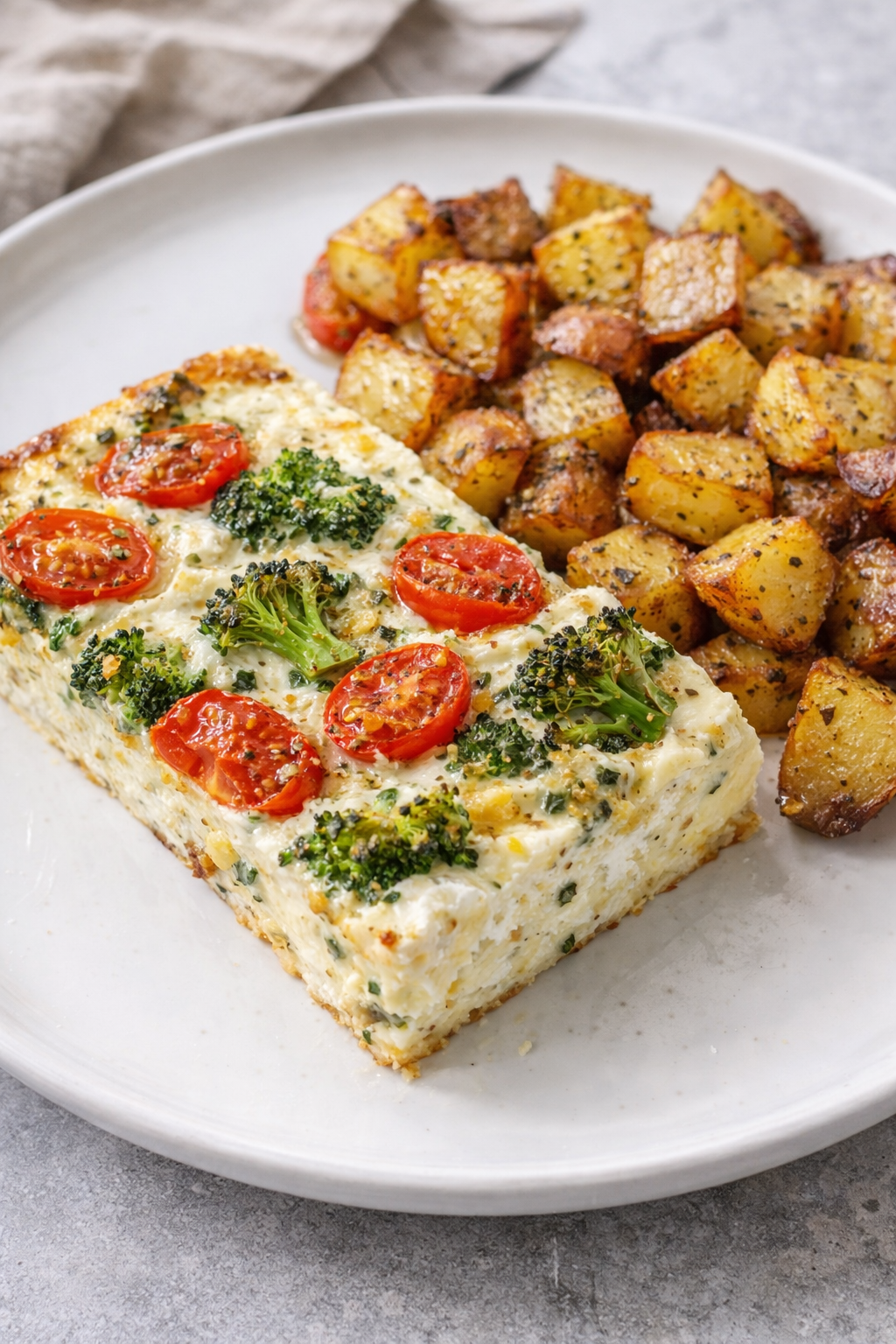 Baked frittata with ricotta and mozzarella, roasted broccoli, and grape tomatoes, finished with Parmesan and aromatic Italian herbs. With roasted red breakfast home fries.